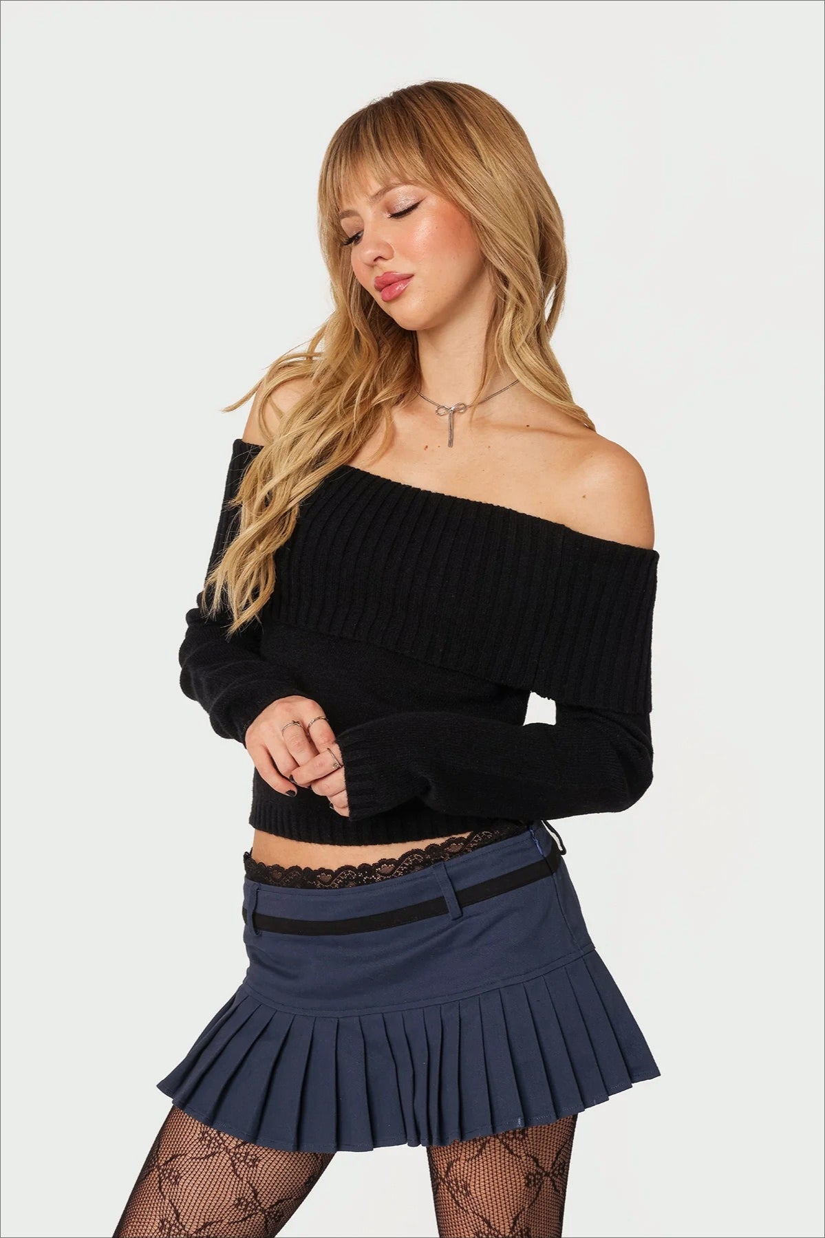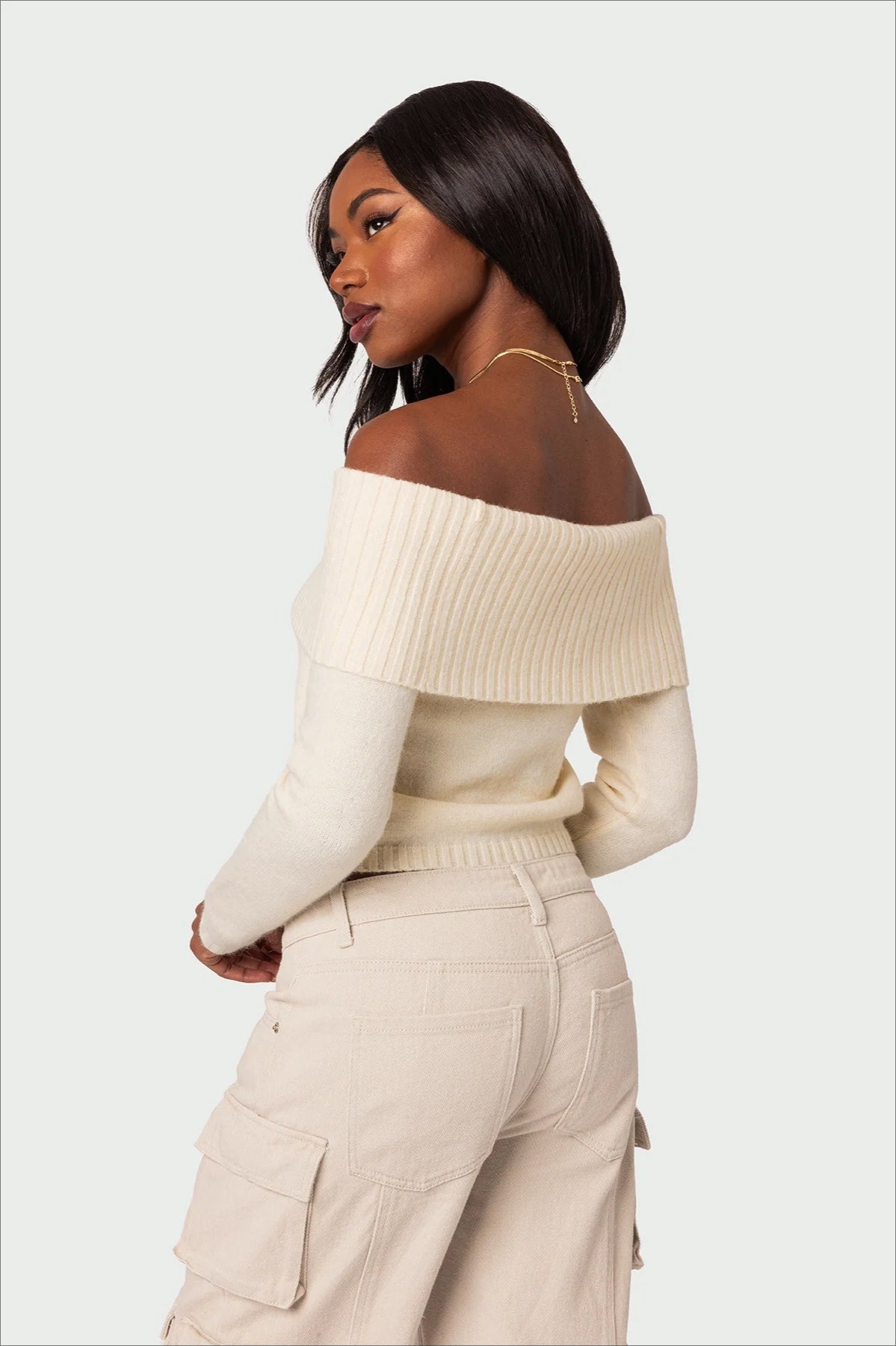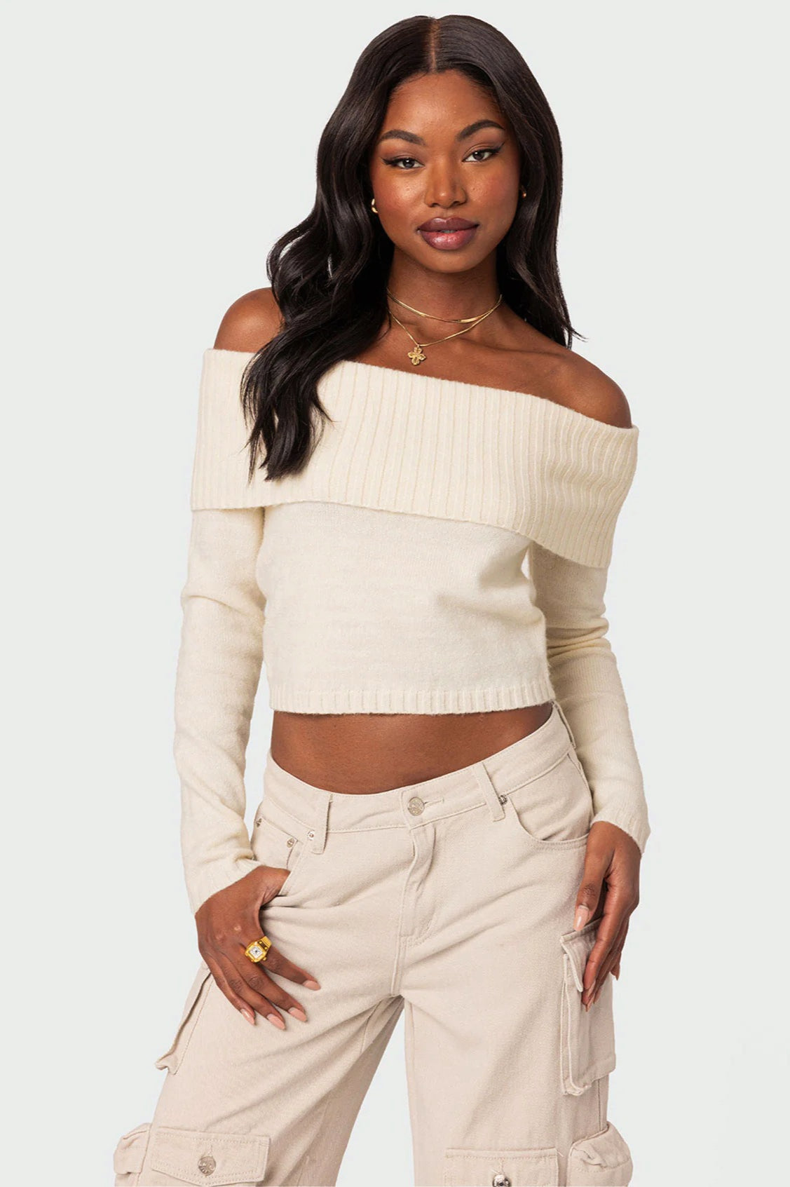 Solid Color Off-Shoulder Boat Neck Long-Sleeve Knit Top