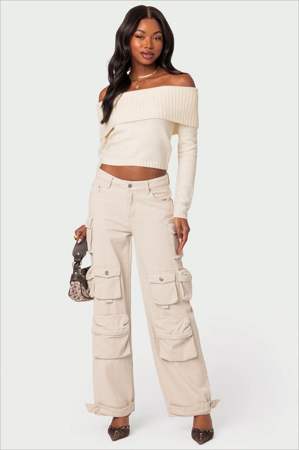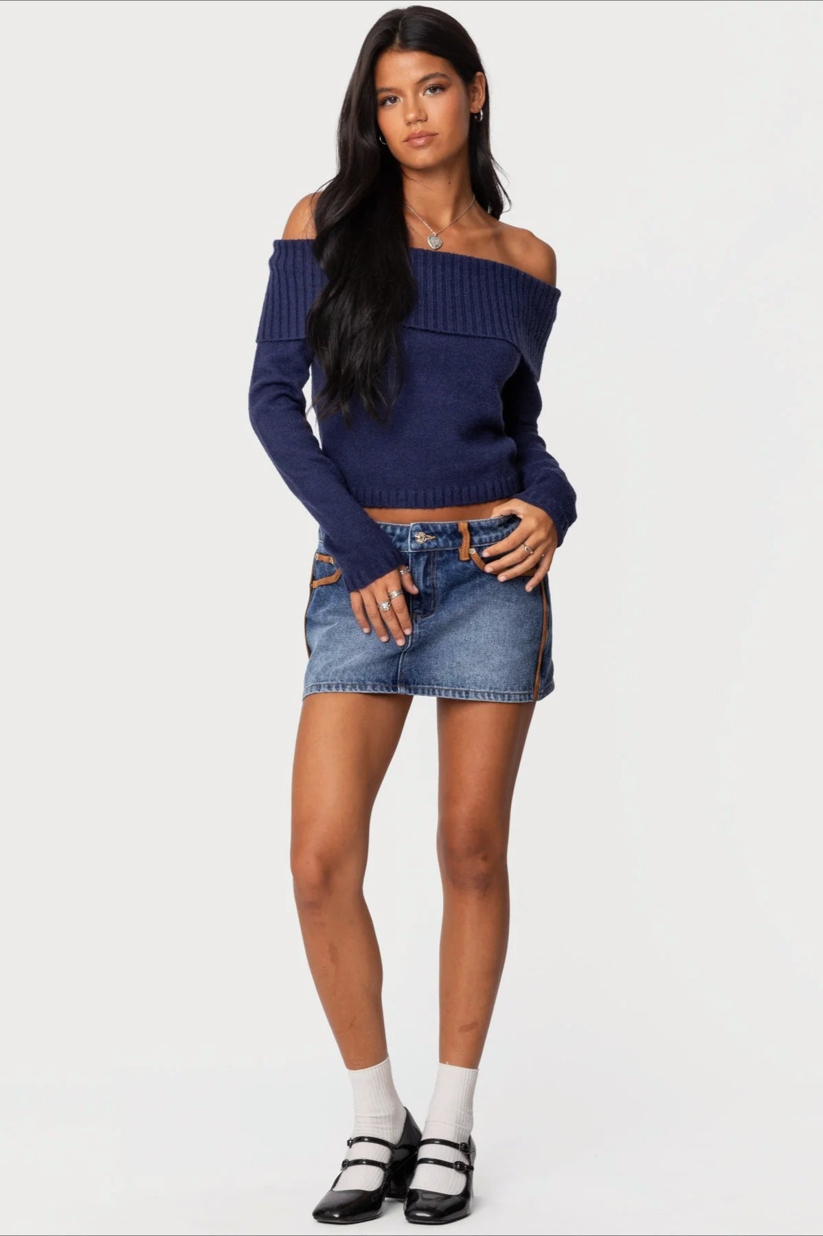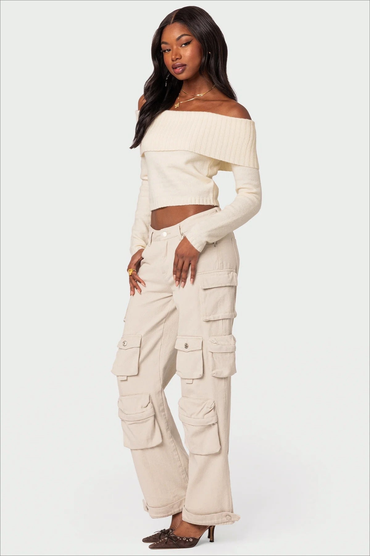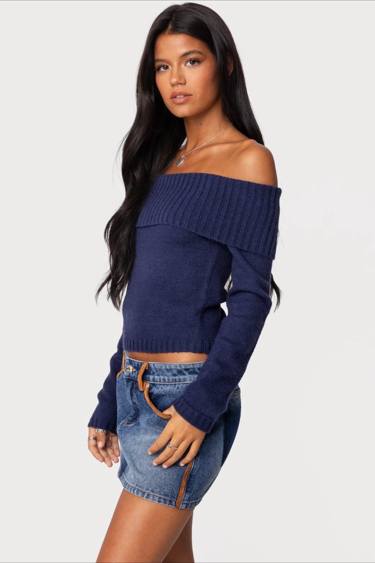 Solid Color Off-Shoulder Boat Neck Long-Sleeve Knit Top