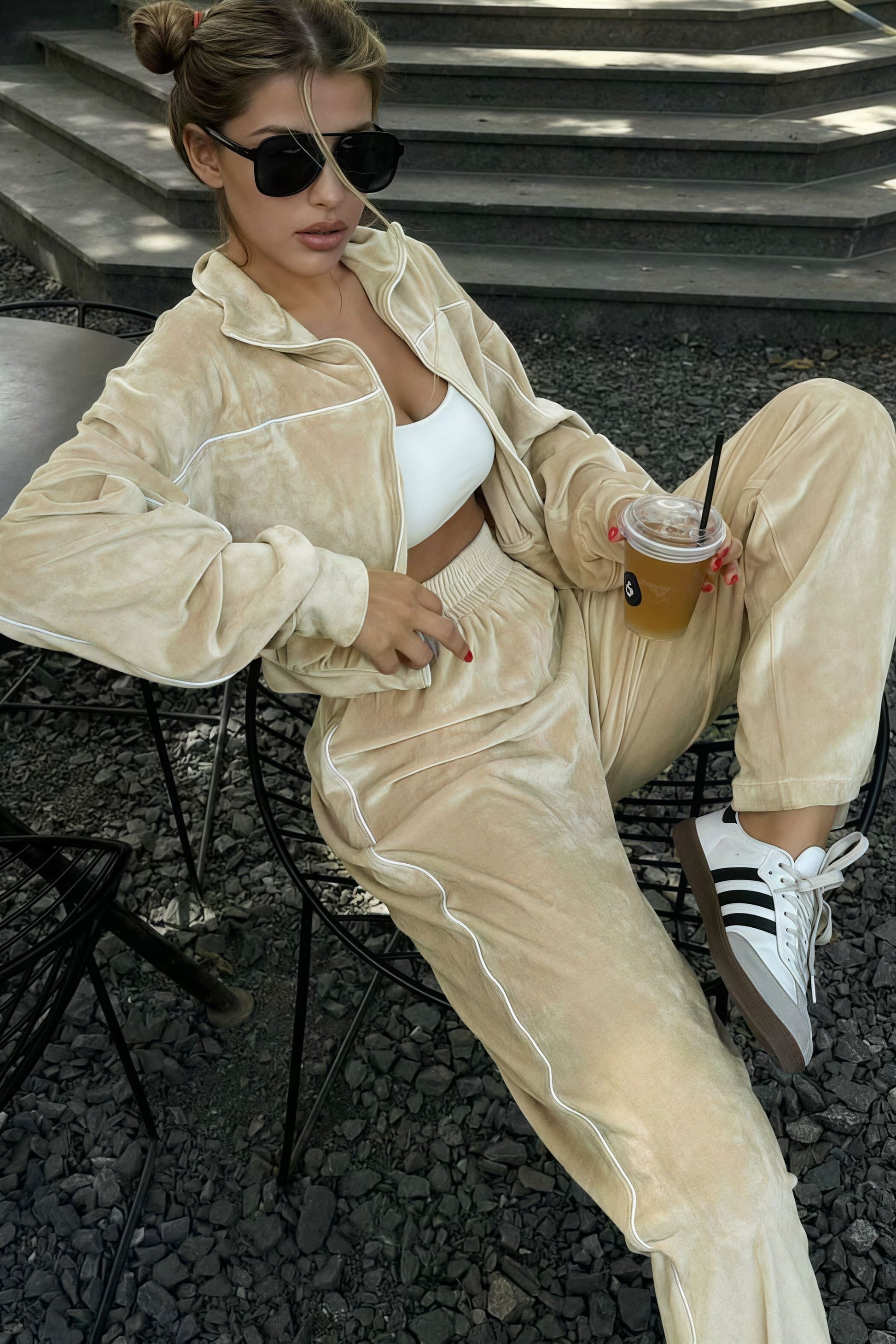 Athletic Velvet Collar Zipper Long Sleeve Two Piece Set