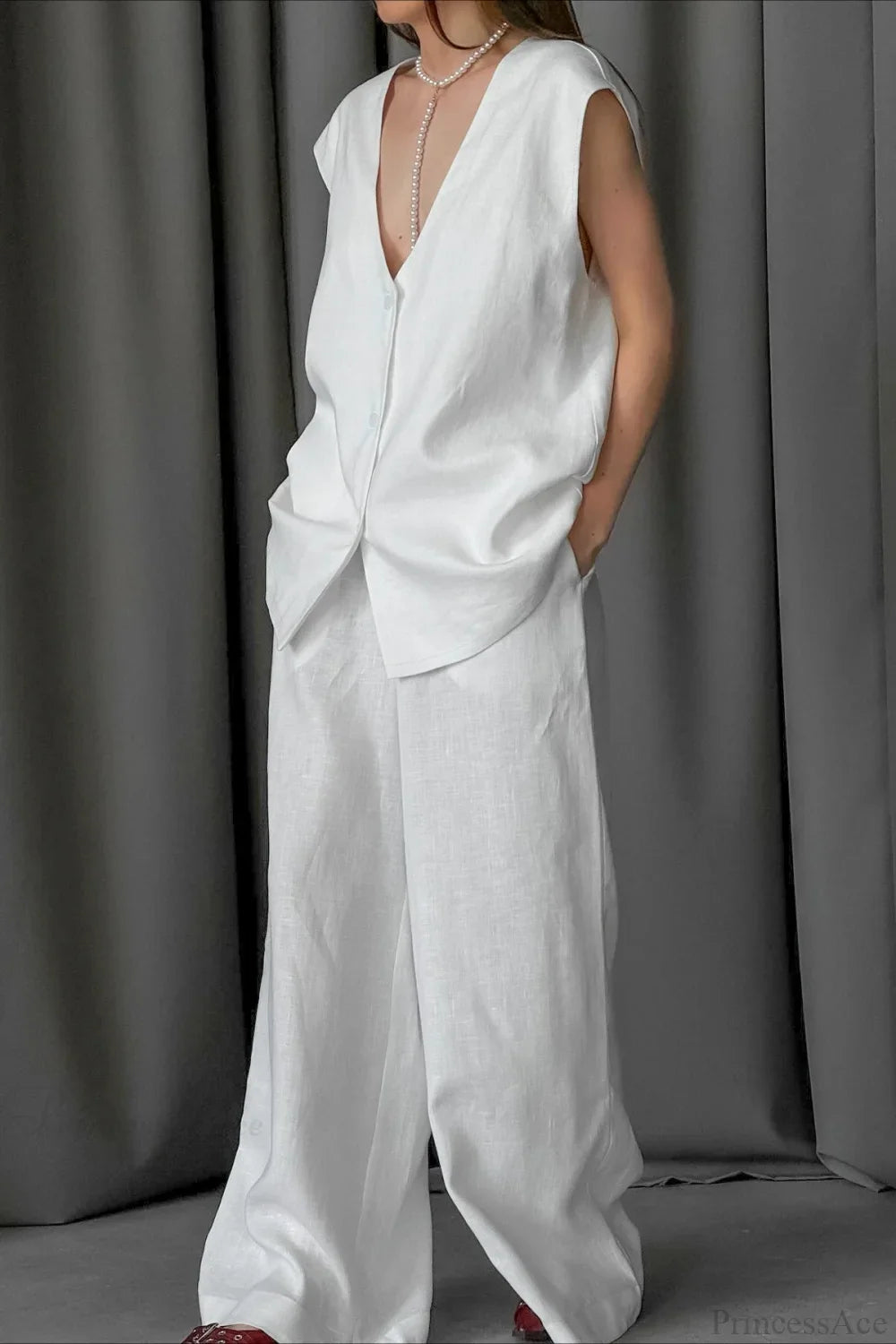 V-Neck Cotton Linen Sleeveless Vest Two Piece Set