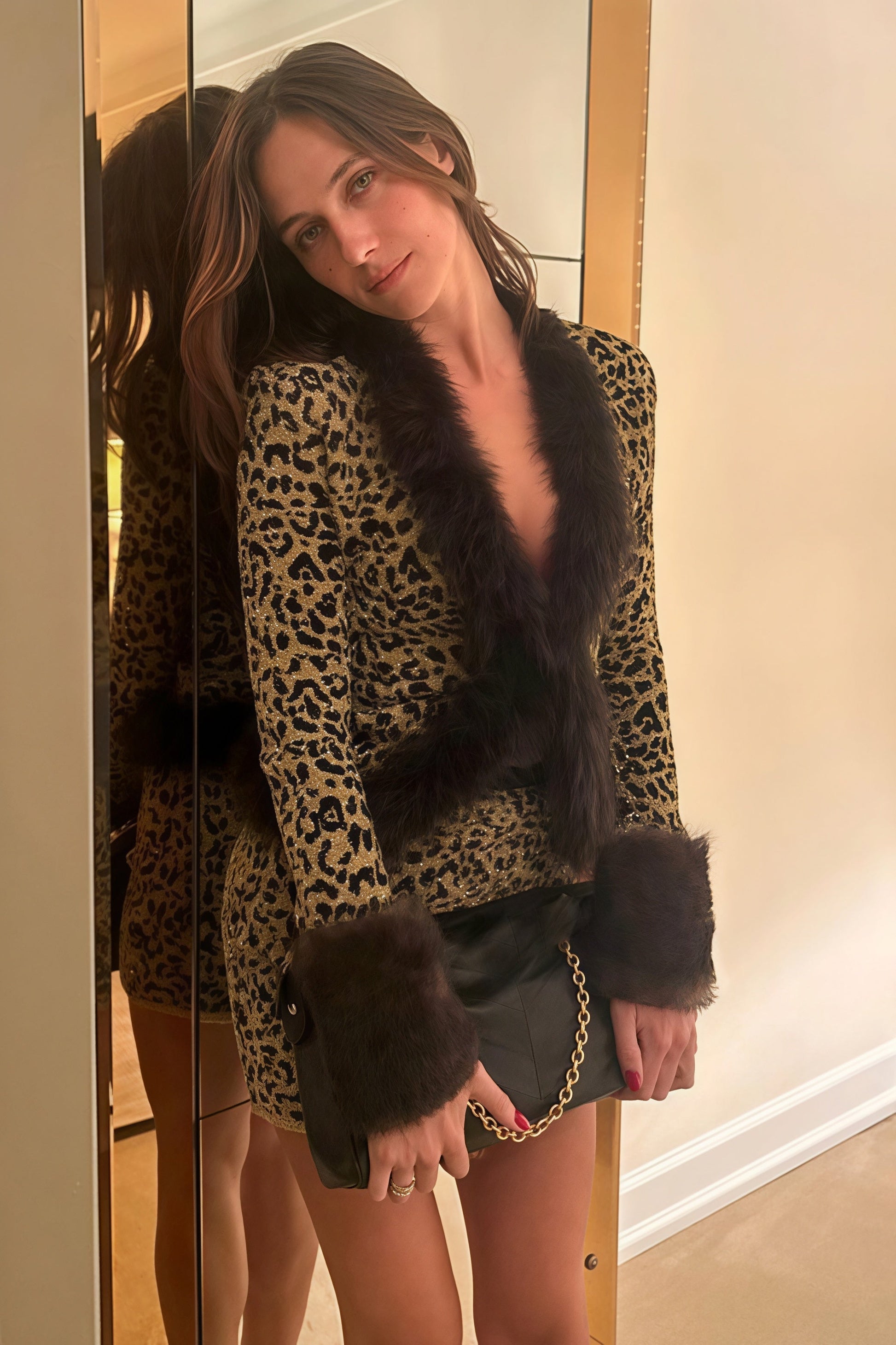 Leopard Print Shiny Fur Collar Patchwork Two Piece Set